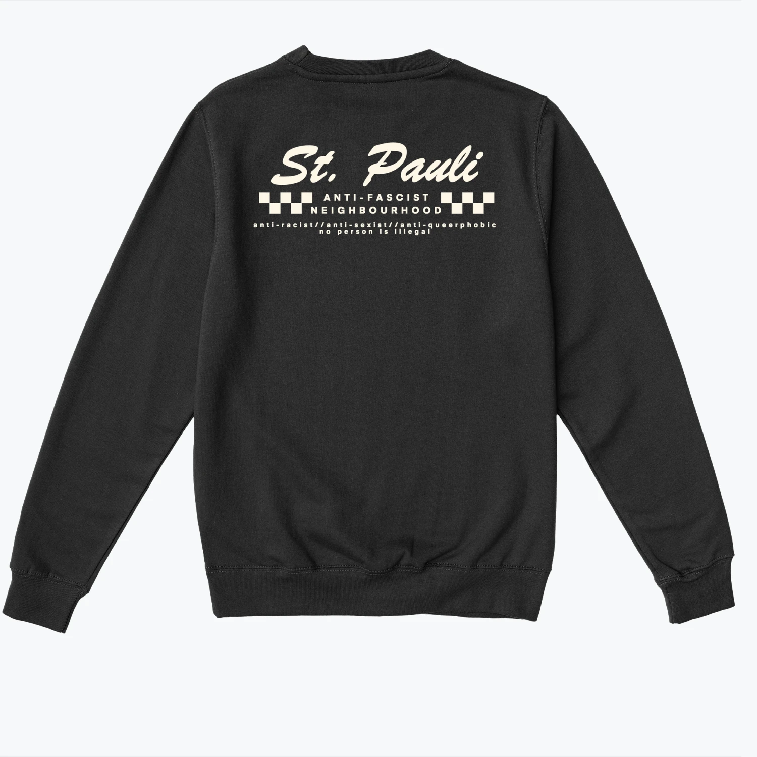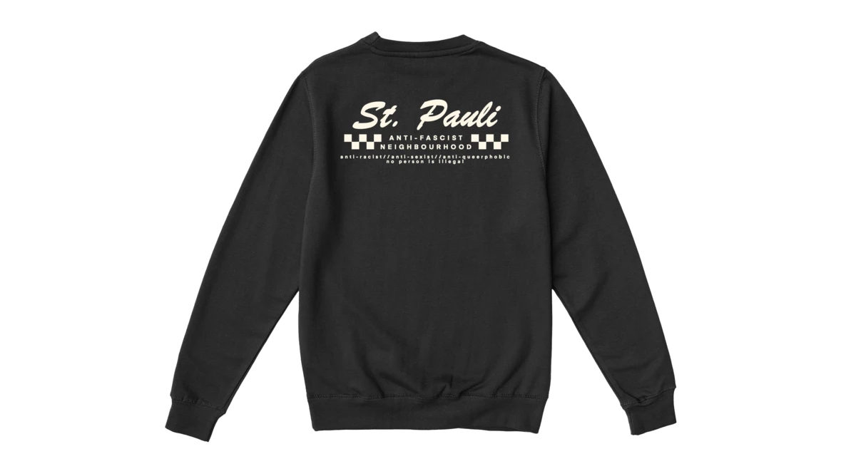 St. Pauli Anti-Fascist Neighbourhood – one of those sweaters that will look better the more it’s worn.The ESSENTIAL CLASSIC sweatshirt is available in a relaxed fit and features a round, ribbed neckline, ribbed hemline, and ribbed cuffs. This design is made from 80% ringspun cotton and 20% polyester, and features a brushed underside. This style is Sedex and WRAP approved and 280 gsm.